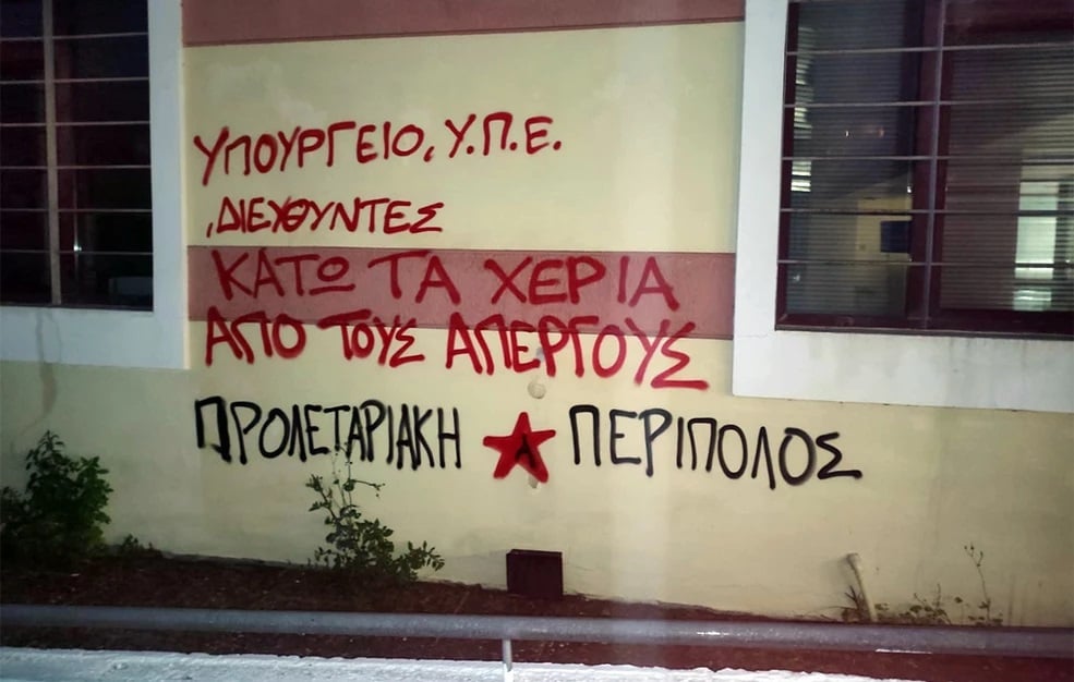 Κατά τις νυχτερινές ώρες προχώρησαν σε βανδαλισμό μέσω συνθημάτων στους εξωτερικούς τοίχους του κτιρίου της 7ης Υγειονομικής Περιφέρειας (Κρήτη) και της εξωτερικής περίφραξης του αύλειου χώρου, από ομάδα που αποκαλείται “προλεταριακή περίπολος”.