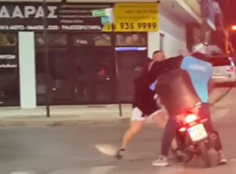 Στις εικόνες φαίνεται ένας άνδρας να έχει πλησιάσει τον διανομέα στο μηχανάκι του και να τον γρονθοκοπά