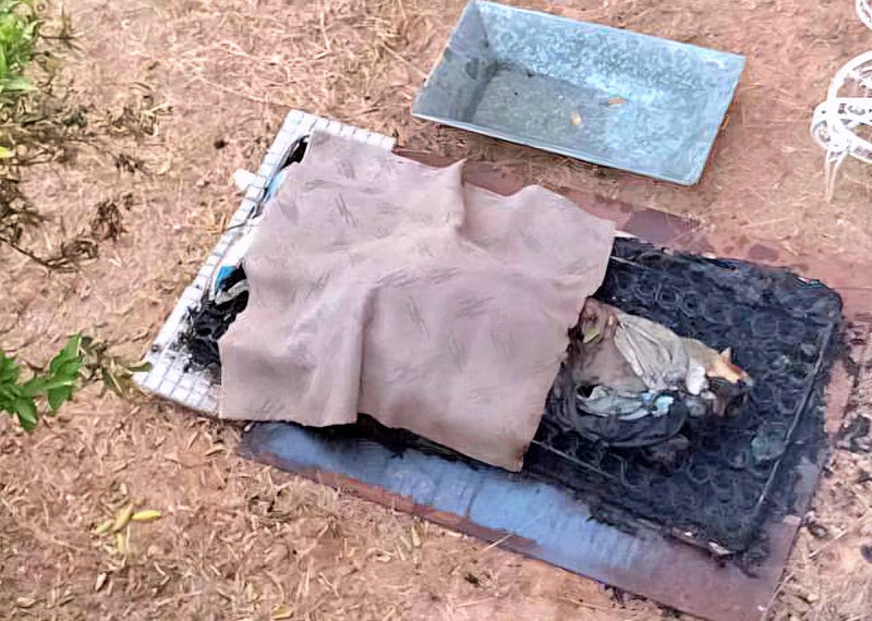 Ωστόσο, η έντονη μυρωδιά που ήταν αισθητή πλέον σε όλη την γειτονιά, τον οδήγησε στην σκέψη να βάλει φωτιά και να κάψει την σορό στην αυλή του σπιτιού, όπου την μετέφερε πάνω σε ένα στρώμα, κάτι που κατά πάσα πιθανότητα, όπως προκύπτει από την αστυνομική έρευνα, έγινε την Τρίτη. Ο γιος φέρεται να έχει αρνηθεί, ότι τεμάχισε την σορό του πατέρα του, η οποία εμφανίζει σημάδια αποκοπής του κεφαλιού και των ποδιών, υποστηρίζοντας ότι όπως μετέφερε την σορό με το στρώμα, μέλη αποκολλούνταν και έφευγαν από τον κορμό του σώματος.