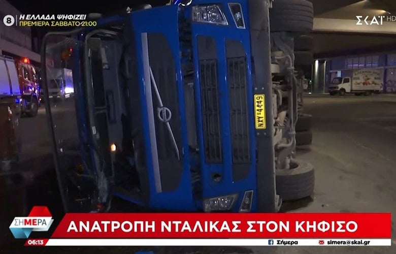 Ανατροπή νταλίκας σημειώθηκε τα ξημερώματα στον παράδρομο της Λεωφόρου Κηφισού στο ύψος της Ιεράς Οδού με κατεύθυνση προς τον Πειραιά.
