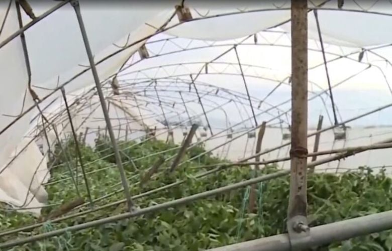Οι καλλιέργειες έκτασης περίπου πέντε στρεμμάτων μοιάζουν με βομβαρδισμένο τοπίο. Ο Γιώργος Τσιτσιός παραγωγός κηπευτικών στα Βασιλικά Θεσσαλονίκης, δείχνει στην κάμερα της ΕΡΤ ό,τι απέμεινε από τα θερμοκήπια του, κύρια πηγή εισοδήματος για την οικογένεια του.