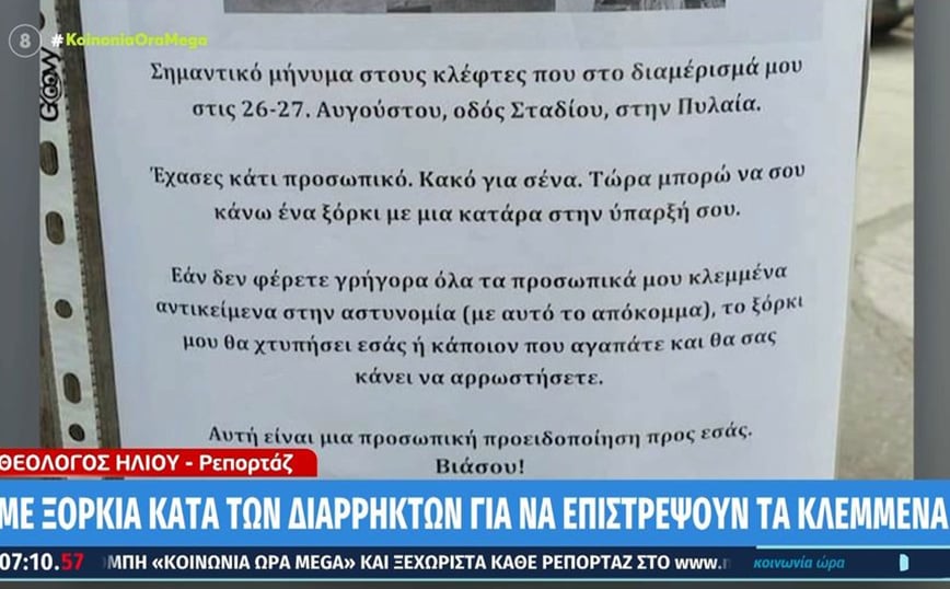 Viral έχει γίνει το σημείωμα ενός θύματος ληστείας στη Θεσσαλονίκη, το οποίο προειδοποιεί με… κατάρες τους δράστες. Το συγκεκριμένο άτομο κόλλησε παντού στην πόλη σημείωμα με ξόρκια, κατάρες και προειδοποιήσεις, στέλνοντας μήνυμα στους κλέφτες που μπήκαν στο σπίτι του.