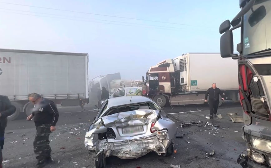 Στο τροχαίο, που σημειώθηκε λίγο πριν τις 9 το πρωί λόγω της πυκνής ομίχλης που υπήρχε, ενεπλάκησαν συνολικά 13 αυτοκίνητα εκ των οποίων τα τέσσερα φορτηγά