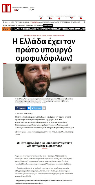 Με τον ανασχηματισμό της κυβέρνησης ασχολήθηκαν και διεθνή μέσα. Το πιο ιδιαίτερο ρεπορτάζ έχει όμως η γερμανική εφημερίδα Bild η οποία εστιάζει στην (υφ)υπουγοποίηση του Νικόλαου Γιατρομανωλάκη. Μάλιστα αυτό έχει κάνει βασικό -και εντυπωσιακό- τίτλο στο θέμα της: “Η Ελλάδα έχει τον πρώτο υπουργό ομοφυλοφίλων” προσθέτοντας ότι “ο Γιατρομανωλάκης θα μπορούσεε να γίνει το νέο αστέρι της κυβέρνησης”…