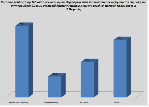 Πρώτος στις αξιολογήσεις των ερωτηθέντων πολιτών στην Β’ Πειραιά έρχεται ο δημοσιογράφος και βουλευτής Δημήτρης Μαρκόπουλος με 38,6% και δεύτερος ο παλαιός κοινοβουλευτικός του κόμματος, πρώην αντιπρόεδρος της Βουλής, Γιάννης Τραγάκης με 11,3%. Υψηλά ποσοστά, πάντως, κατέχουν τόσο ο… κανένας (19,1%), όσο και το «δεν ξέρω / δεν απαντώ» (31%).