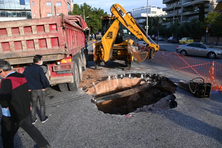 Η καθίζηση οφείλεται σε διάτρηση του αγωγού απορροής ομβρίων από αγωγούς τηλεφωνικού δικτύου, με συνέπεια τη σπηλαίωση του υπεδάφους στο σημείο του ρήγματος επί του παλαιού αγωγού ομβρίων της ΕΥΔΑΠ, όπως υπογραμμίστηκε στο ΑΠΕ ΜΠΕ.
