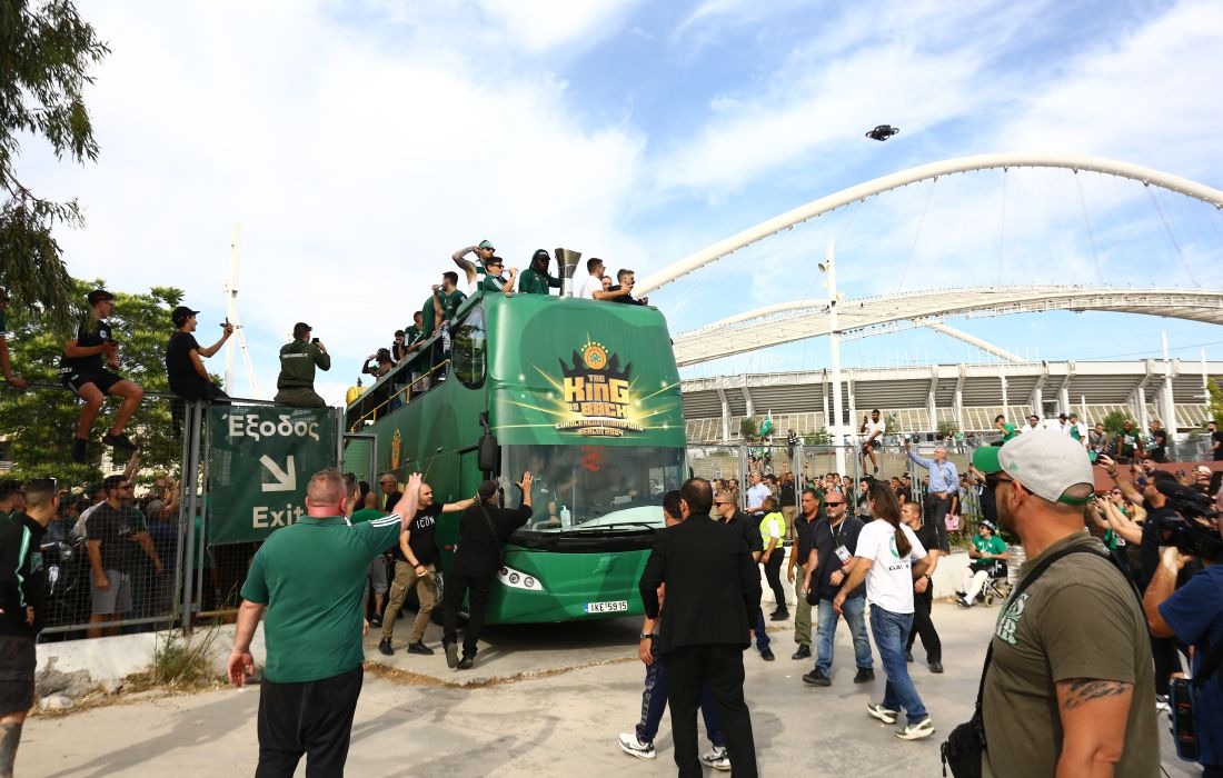 Οι πρωταθλητές της Ευρώπης έφτασαν στο Ολυμπιακό Στάδιο της Αθήνας με το ανοιχτό καταπράσινο λεωφορείο που μεταφέρει τους τροπαιούχους της Ευρώπης. Η αποθέωση συνεχίστηκε και εκεί για τους παίκτες του Παναθηναϊκού, μετά την κατάκτηση της Euroleague.