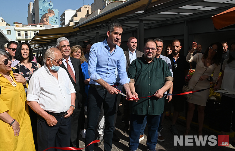 Ο Κώστας Μπακογιάννης έκοψε την κόκκινη κορδέλα που είχε τοποθετηθεί μπροστά από την ανανεωμένη λαχαναγορά της Βαρβακείου και συνομίλησε με τους επιχειρηματίες που διατηρούν εκεί καταστήματα.