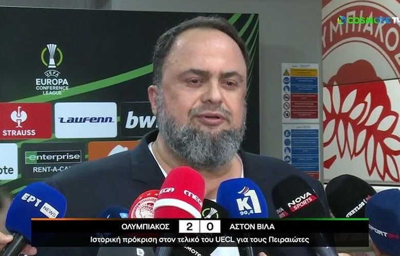Ο Ολυμπιακός ζει τη μεγαλύτερη στιγμή της ιστορίας του με την πρόκριση στον τελικό του Europa Conference League μετά τη νίκη με 2-0 επί της Άστον Βίλα και ο Βαγγέλης Μαρινάκης δεν έκρυψε τη συγκίνησή του στις δηλώσεις του, αν και δεν παρέλειψε να ρίξει τις μπηχτές του για την ΕΠΟ και την κυβέρνηση.