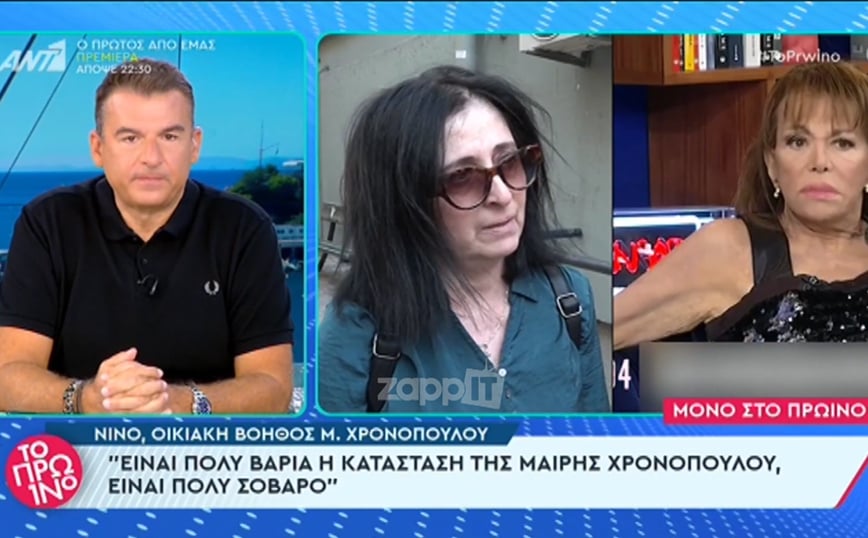 «Η κατάστασή της είναι πολύ βαριά, όπως ήταν. Εκείνη την ημέρα που έπεσε, είχα ρεπό. Συνήθως την έπαιρνα τηλέφωνο το απόγευμα. Εκείνη τη μέρα δεν μου απαντούσε και κατάλαβα αμέσως. Ξεκίνησα να πάω στο σπίτι της, ήμουν στην Αθήνα και η Παιανία ήταν μακριά», είπε η οικιακή βοηθός για την Μαίρη Χρονοπούλου.