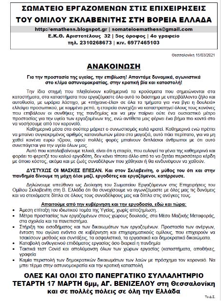 «ΔΥΣΤΥΧΩΣ ΟΙ ΜΑΣΚΕΣ ΕΠΕΣΑΝ. Και στον Σκλαβενίτη, ο μύθος του ότι δίνουμε τη μάχη όλοι μαζί, εργοδότες και εργαζόμενοι, κατέρρευσε», τονίζουν χαρακτηριστικά.