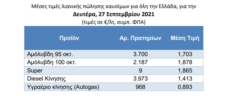 Σύμφωνα με το χθεσινό δελτίο τιμών καυσίμων οι μέσες τιμές λιανικής πώλησης καυσίμων για όλη την Ελλάδα διαμορφώνονται ως εξής: