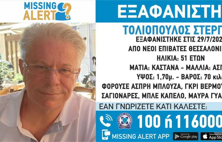«Στις 30/07/2021, εξαφανίστηκε από την περιοχή των Νέων Επιβατών Θεσσαλονίκης, ο Τολιόπουλος Στέργιος, 51 ετών. Το «Χαμόγελο του Παιδιού» ενημερώθηκε για την εξαφάνιση του Τολιόπουλου Στέργιου και προχώρησε στη δημοσιοποίηση των στοιχείων του ενήλικου κατόπιν αιτήματος των οικείων του καθώς ενδέχεται να συντρέχουν λόγοι οι οποίοι θέτουν τη ζωή του σε κίνδυνο. Ο Τολιόπουλος Στέργιος έχει ύψος 1,70 μ., έχει 70 κιλά βάρος, έχει άσπρα μαλλιά και καστανά μάτια. Φορούσε άσπρη μπλούζα, γκρι βερμούδα, μαύρες σαγιονάρες, μπλε καπέλο και μαύρα γυαλιά μυωπίας».