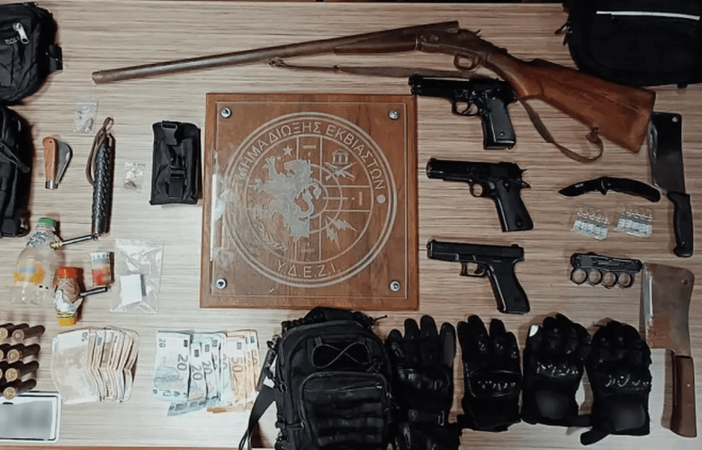 Από τις σωματικές έρευνες που πραγματοποιήθηκαν, αλλά και τις έρευνες σε οικίες, βρέθηκαν και κατασχέθηκαν, μεταξύ άλλων: μεταλλική σιδερογροθιά με ενσωματωμένο αναδιπλούμενο μαχαίρι, 3 μπαλτάδες, πτυσσόμενο γκλοπ, νάιλον συσκευασίες, που περιείχαν 1,5 γραμμάριο ακατέργαστης κάνναβης, αναδιπλούμενο μαχαίρι και αναδιπλούμενος σουγιάς, 3 αεροβόλα πιστόλια, τσεκούρι μεσαίου μεγέθους, πινακίδα Ι.Χ.Ε. καταφανώς πλαστή, μονόκαννο κυνηγετικό όπλο άνευ αδείας, 20 φυσίγγια καραμπίνας, 2 αυτοσχέδιες συσκευασίες χρήσης ναρκωτικών ουσιών (φρίμπα) προσαρμοσμένες σε πλαστικά μπουκάλια, χάρτινη συσκευασία με 1,8 γραμμάρια κοκαΐνη, 20 χαρτονομίσματα των 50 ευρώ και χαρτονόμισμα των 200 ευρώ, καταφανώς πλαστά.