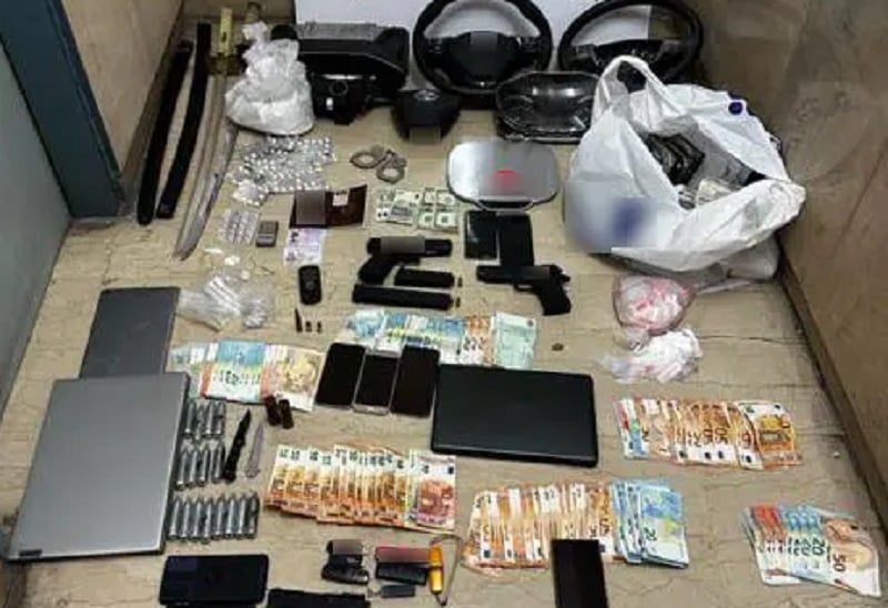 – 70 γραμμάρια ηρωίνης,- νάιλον συσκευασίες και μπουκαλάκια με ποσότητες ναρκωτικών και άλλων ουσιών σε στερεά και υγρή μορφή,- ναρκωτικά δισκία, 81 σφραγισμένα δισκία τρυγικής μετοπρολόλης, καρτέλα με 4 οπιοειδή δισκία και 16 αμπούλες προωθητικού αερίου,- 5 ζυγαριές ακριβείας,- 7.570 ευρώ,- 5 διαβατήρια, 11 κινητά τηλέφωνα, 3 laptop, πλήθος σκληρών δίσκων, 7 οθόνες Η/Υ, 4 κάμερες παρακολούθησης, 7 USB, ηλεκτρονική φορητή συσκευή (ταμπλέτα),- 2 σπαθιά, 2 μαχαίρια, πιστόλι, 2 γεμιστήρες, 32 φυσίγγια, 3 κομμάτια κλείστρου για μετατροπή σε αυτόματο όπλο, πιστόλι σε απομίμηση, ζευγάρι χειροπέδες, πιστόλι αερίου, αεροβόλο πιστόλι,ιδιόχειρες σημειώσεις που αφορούν τυχερά παίγνια.