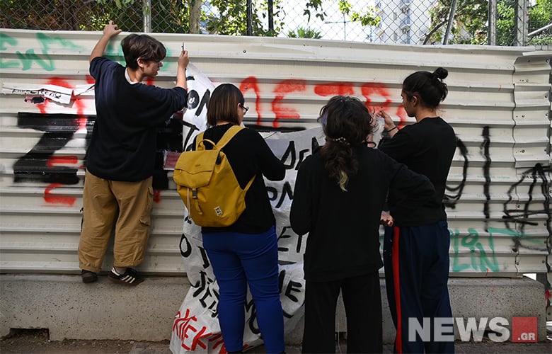 Όταν έφτασαν στο εργοτάξιο του μετρό Εξαρχείων, κρέμασαν το πανό τους. Σε αυτό, αναγραφόταν: «Κομμένα δέντρα, αποστειρωμένο Πολυτεχνείο. Αυτό σημαίνει εξευγενισμός. Φ.Σ. Αρχιτεκτονικής».