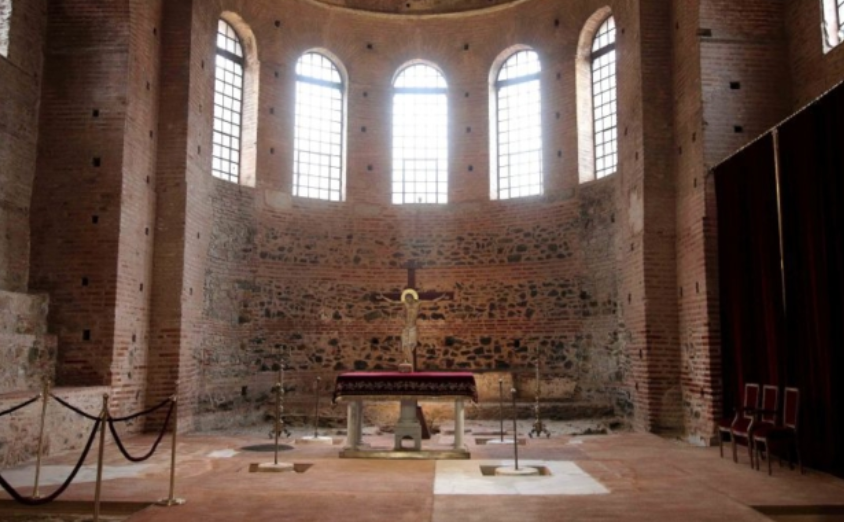 Χωρίς να δώσει περισσότερες εξηγήσεις, πέταξε στο έδαφος το σακίδιό του και άρχισε να τρέχει προς το εσωτερικό της Ροτόντας. Η υπάλληλος τον ακολούθησε. Ο 21χρονος είχε ήδη φτάσει στην Αγία Τράπεζα (το μνημείο λειτουργεί και ως ορθόδοξος ναός) και είχε αφαιρέσει τα καλύμματά της. Αμέσως μετά κινήθηκε προς τον Σταυρό. Τον χτύπησε με δύναμη και τον έσπασε. Η υπάλληλος τον πλησίασε και προσπάθησε να τον ηρεμήσει.