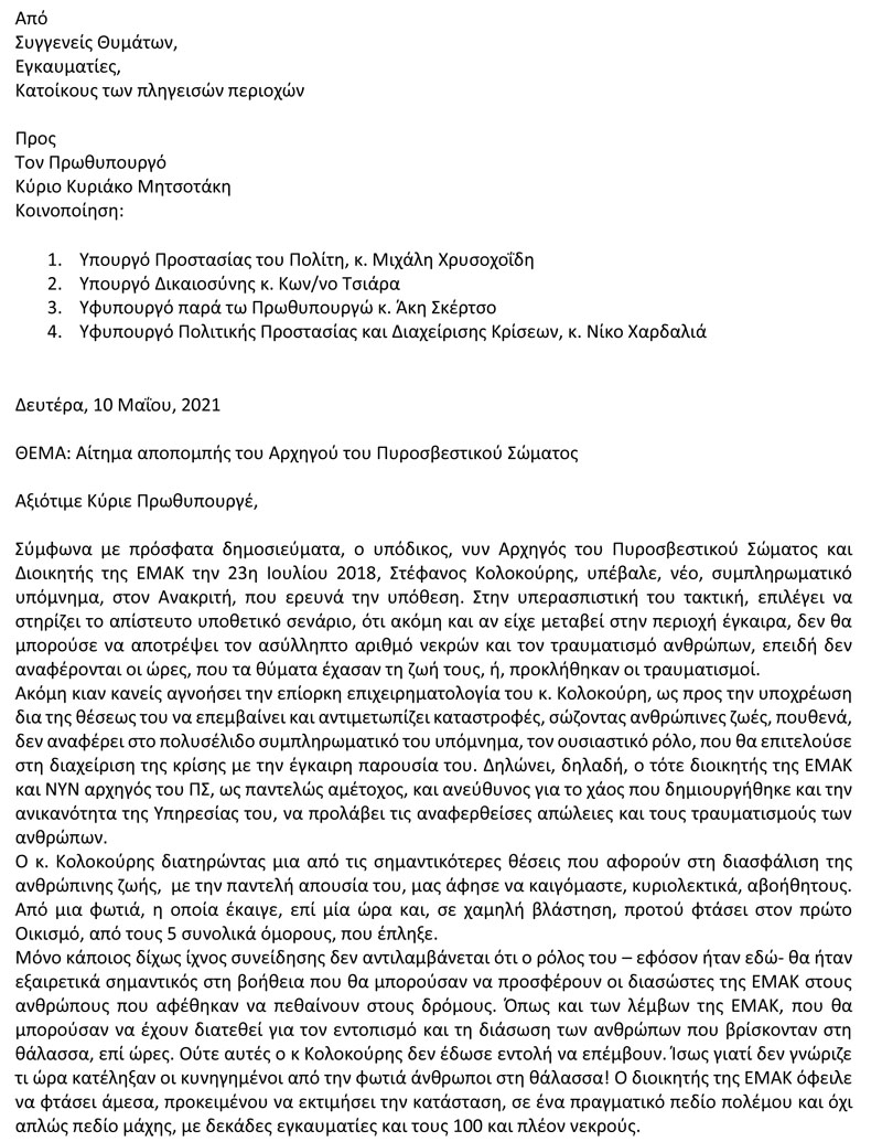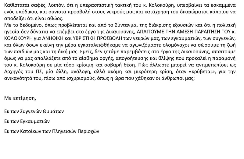 Και καταλήγουν: «Εμείς, δεν ζητάμε παρεμβάσεις στο έργο της Δικαιοσύνης, απαιτούμε όμως να μας απαλλάξετε από το αίσθημα οργής, απογοήτευσης και θλίψης που προκαλεί η παραμονή του κ. Κολοκούρη σε μία τόσο κρίσιμη και σοβαρή θέση». Πυρκαγιά Ματι