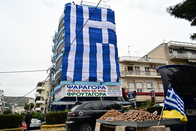 Μία τεράστια ελληνική σημαία κυματίζει στη Λεωφόρο Σαλαμίνος, στο Κερατσίνι, με αφορμή τον αυριανό εορτασμό της 25ης Μαρτίου.