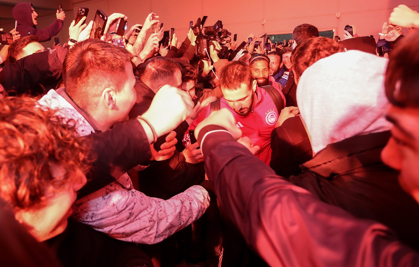 Μόλις έφτασε η αποστολή του Ολυμπιακού οι οπαδοί άρχισαν να φωνάζουν συνθήματα και να χειροκροτούν τους παίκτες ενώ πολλοί πλησίασαν τον προπονητή Χοσέ Λουίς Μεντιλίμπαρ για να αγγίξουν το έμβλημα της ομάδας πάνω στο μπουφάν του.