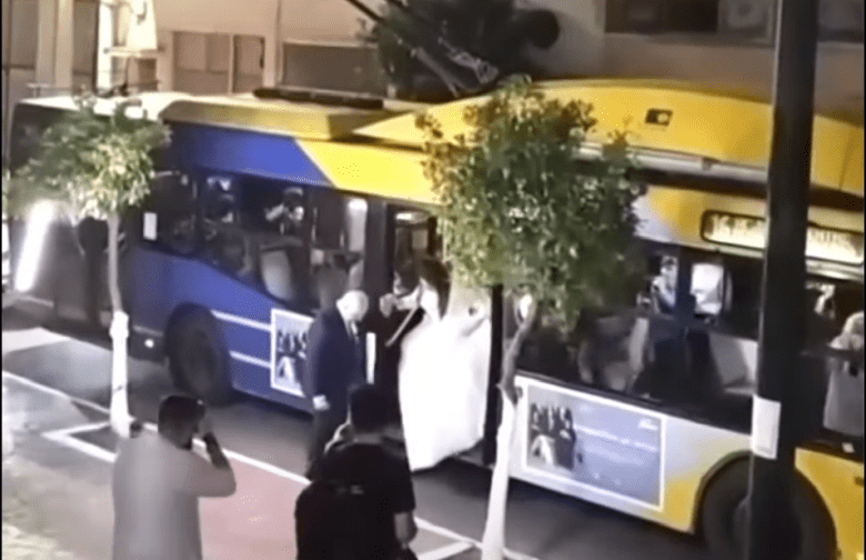 Απανωτά ήταν τα φωτογραφικά φλας, ενώ κόρνες και έκπληκτοι πολίτες σταμάτησαν για να χαζέψουν το απροσδόκητο θέαμα μιας υπέρλαμπης νύφης να αποβιβάζεται από το μέσο μαζικής μεταφοράς.