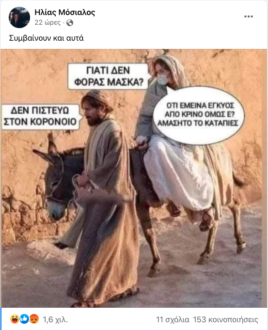 Την αντίδραση της Εκκλησίας προκάλεσε μια ανάρτηση του Ηλία Μόσιαλου για τον κορονοϊό με πρωταγωνιστές την Παναγία και τον Ιωσήφ.