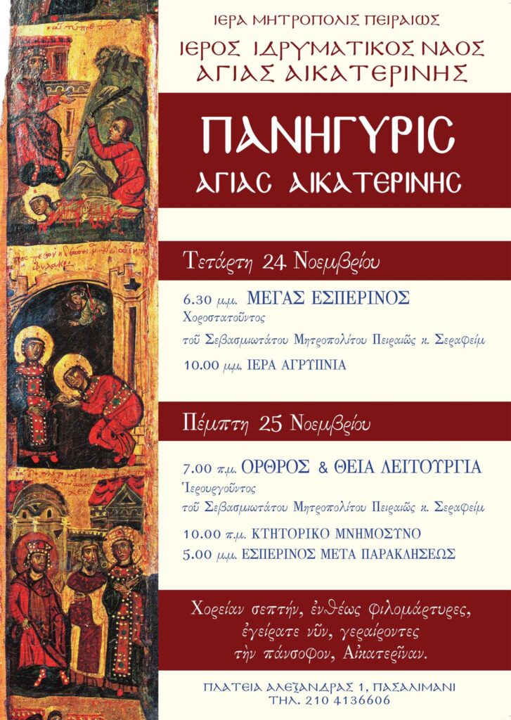 Επ΄ευκαιρία της εορτής της Αγίας Μεγαλομάρτυρος Αικατερίνης της πανσόφου, πανηγυρίζει την Πέμπτη 25/11 ο φερώνυμος Ιερός Ναός της Μητροπολιτικής περιφέρειας Πειραιώς που βρίσκεται στην Καστέλλα με το ακόλουθο πρόγραμμα: Σήμερα Τετάρτη 24/11 στις 18:30 θα ψαλεί Μέγας πανηγυρικός εσπερινός χοροστατούντος του Σεβασμιωτάτου Μητροπολίτου Πειραιώς κ. Σεραφείμ. Στις 22:00 θα αρχίσει η τέλεση ιεράς αγρυπνίας. Την Πέμπτη 25/11 το πρωί, ο Σεβασμιώτατος Μητροπολίτης Πειραιώς κ. Σεραφείμ θα τελέσει τη Θεία Λειτουργία. Στις 17:00 θα τελεσθούν ο Εσπερινός και η Παράκληση της Αγίας.