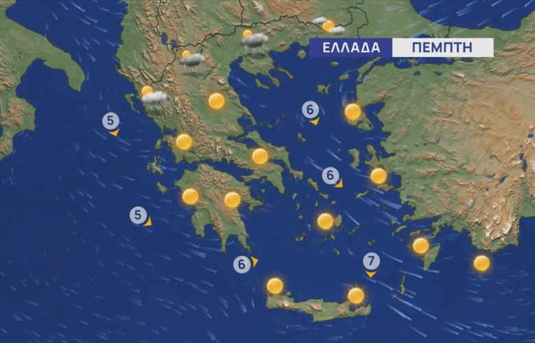 Την Πέμπτη περιμένουμε γενικά ηλιοφάνεια στη χώρα με μπόρες όμως και ισχυρές καταιγίδες από το μεσημέρι στα βόρεια και κυρίως στη Μακεδονία. Οι άνεμοι βόρειοι 5 με 6 και στα Δωδεκάνησα 7 μποφόρ. Η θερμοκρασία το μεσημέρι θα φτάσει τους 34 με 36 βαθμούς. σύμφωνα με τη μετεωρολόγο της ΕΡΤ Νικολέτα Ζιακοπούλου.
