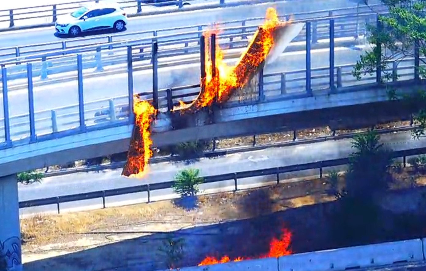 Από το περιστατικό τυλίχτηκαν στις φλόγες τα ηχοπετάσματα που βρίσκονται πλευρικά του δρόμου.