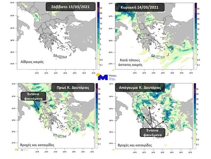 Την Καθαρά Δευτέρα 15/03 βροχές και καταιγίδες θα εκδηλωθούν σχεδόν στο σύνολο της χώρας με τα φαινόμενα κατά τόπους να είναι έντονα. Χιόνια θα πέσουν στα ηπειρωτικά ορεινά καθώς και σε περιοχές της Ηπείρου και της Δυτικής Μακεδονίας με χαμηλότερο υψόμετρο. Παράλληλα, θα επικρατήσουν πολύ ενισχυμένοι άνεμοι δυτικών διευθύνσεων με εντάσεις που από τις μεσημεριανές ώρες θα φτάνουν κατά τόπους τα 8-9 μποφόρ.