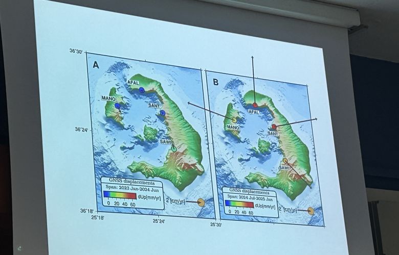 Όπως είπε, από το 2019 το ΑΠΘ και το ΙΜΠΗΣ εγκατέστησαν σταθμούς GNSS για τη γεωδαιτική παρακολούθηση της ηφαιστειακής δραστηριότητας στη Σαντορίνη και το 2025, λειτουργούν συνολικά 32 μόνιμοι σταθμοί στην ευρύτερη περιοχή Σαντορίνης – Ανύδρου. Αναφερόμενος στην έξαρση της σεισμικότητας στην περιοχή Ανύδρου στις αρχές Φεβρουαρίου 2025, ανέφερε ότι τα δεδομένα GNSS κατέγραψαν έντονες και απότομες εδαφικές μετακινήσεις.