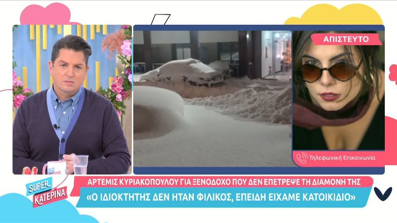 Τον ιδιοκτήτη ξενοδοχείου στο Αμπελοχώρι, κοντά στη Θήβα, που δεν τους άφησε να μείνουν σε δωμάτιο γιατί είχαν σκύλο, ενώ είχαν αποκλειστεί από τον χιονιά, κατήγγειλε η Άρτεμις Κυριακοπούλου στον Alpha και την εκπομπή Super Κατερίνα.