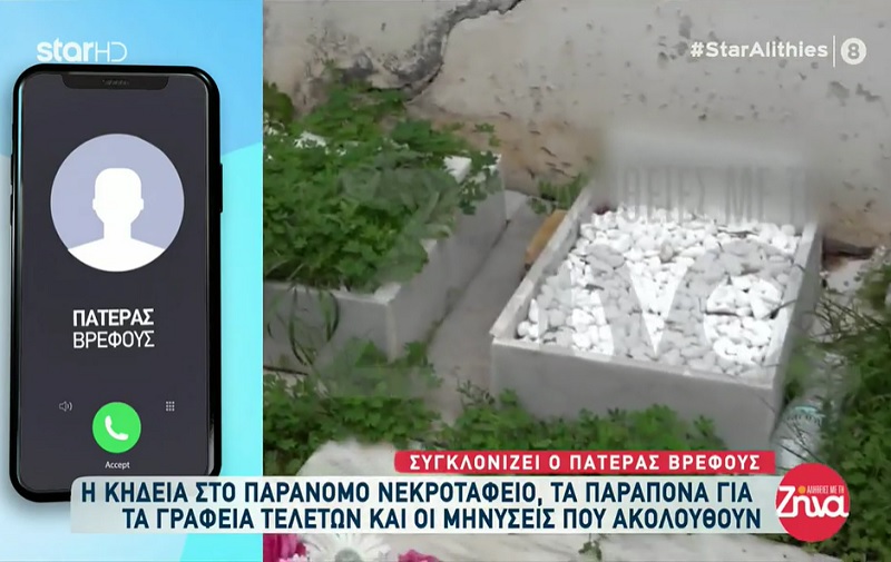 «Μας πρότειναν αυτή την κυρία, που έχει το γραφείο τελετών, για να την εξουσιοδοτήσουμε να κάνει τις ληξιαρχικές πράξεις γέννησης και θανάτου. Ήρθαμε σε επαφή μαζί της και μας ζήτησε το ποσό των 500 ευρώ για όλα αυτά. Μας ειπε για κάσες λευκές, μικρούλες, τις οποίες δεν έκανε. Αργούσε να φτιάξει τον τάφο. Εμείς πήγαμε εκεί μετά από 40 μέρες και είδαμε το χάλι που επικρατούσε, τα σκουπίδια κτλ.» είπε ο πατέρας του μωρού μιλώντας στην εκπομπή «Αλήθειες με τη Ζήνα».