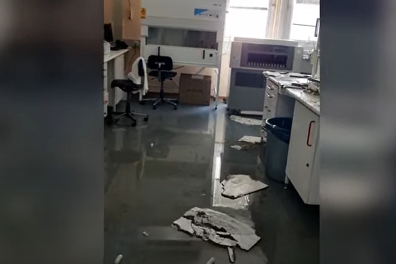 Οι υπάλληλοι του εργαστηρίου βρέθηκαν σήμερα το πρωί μπροστά στην εικόνα της καταστροφής, που σύμφωνα με όλες τις ενδείξεις, προκλήθηκε από σπασμένο σωλήνα νερού υψηλής πίεσης που χρησιμοποιούνταν για πυρόσβεση. Τα νερά υπό πίεση προκάλεσαν ζημιές στην ψευδοροφή από όπου έπεφταν στο πάτωμα και στα μηχανήματα.