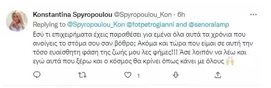 Μετά ήρθε και η απάντηση από την Κωνσταντίνα Σπυροπούλου: «Έχω και εγώ πολλά να πω πλέον όπως εσείς λέτε χωρίς καν να με ξέρετε ότι σας κατέβει, γιατί οι συνεργάτες σας όπως λέτε και εσείς τα διαδίδουν!! Υ.Γ. Την κολλητή σου εννοείς γυναίκα που χάρη σε αυτήν βρίσκεσαι εκεί που βρίσκεσαι και που καθάριζε τους πάντες για σένα».