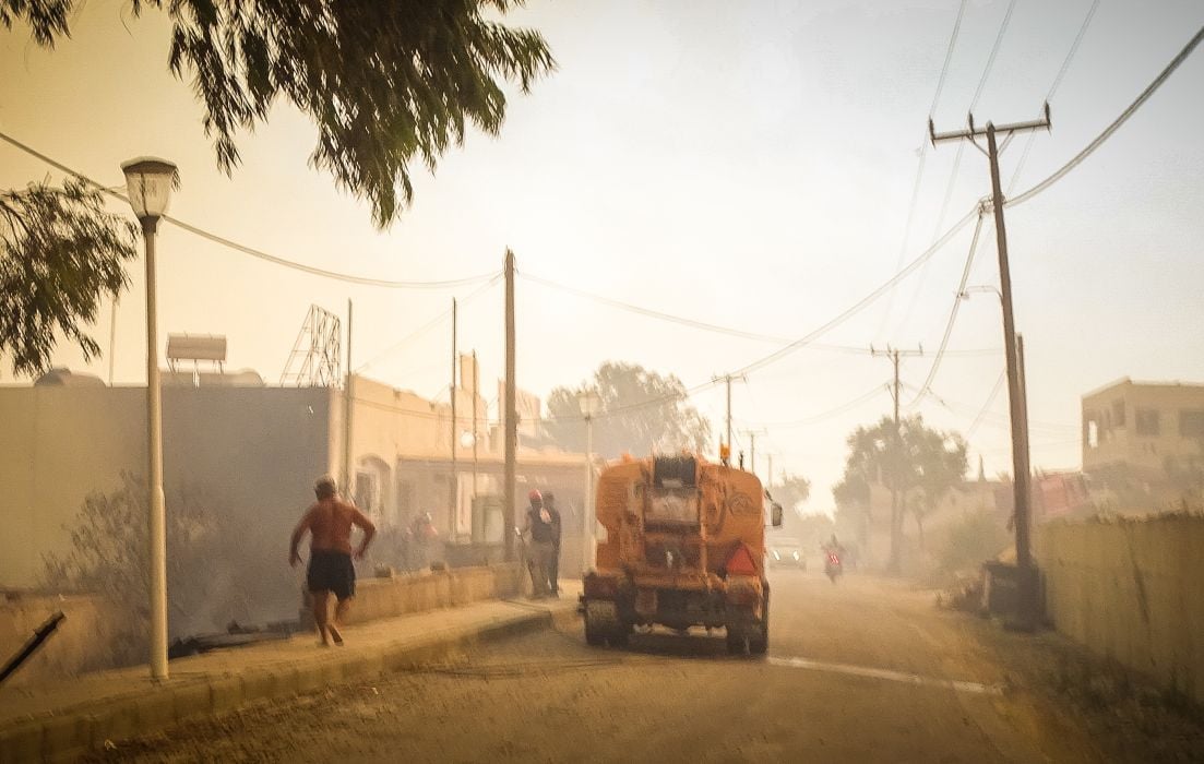 Στην Ρόδο η μάχη των δυνάμεων πυρόσβεσης γίνεται σε τρία μέτωπα, ενώ το νησί εκκενώνεται από τους ξένους τουρίστες, Ήδη έχει στηθεί γραφείο στο αεροδρόμιο για να διευκολυνθεί η αποχώρησή τους.