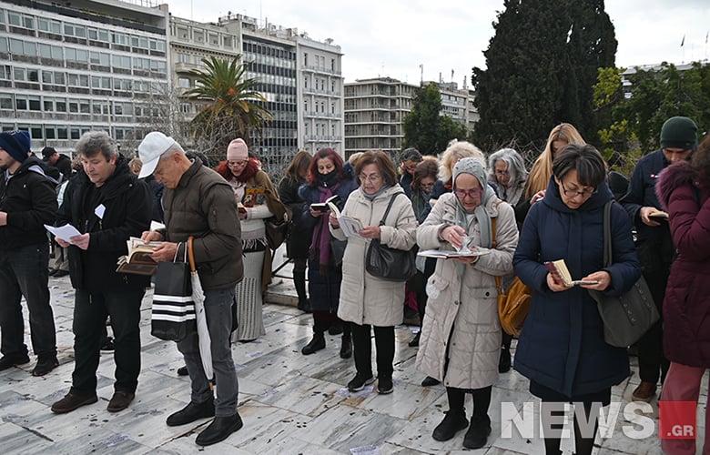 Ενάντια στο νομοσχέδο για τον γάμο ομόφυλων ζευγαριών διαδηλώνει ένα γκρουπ Χριστιανών που ψάλλει, κρατάει εικόνες και θυμιατίζει έξω από την Βουλή.