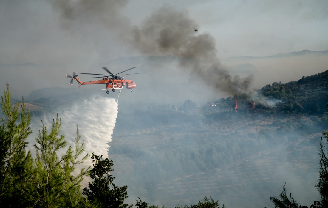 Η πυρκαγιά κατακαίει δασική περιοχή με πευκοδάσος και χαμηλή βλάστηση, ενώ οι φλόγες κινούνται απειλητικά προς την περιοχή του Λωβοκομείου.