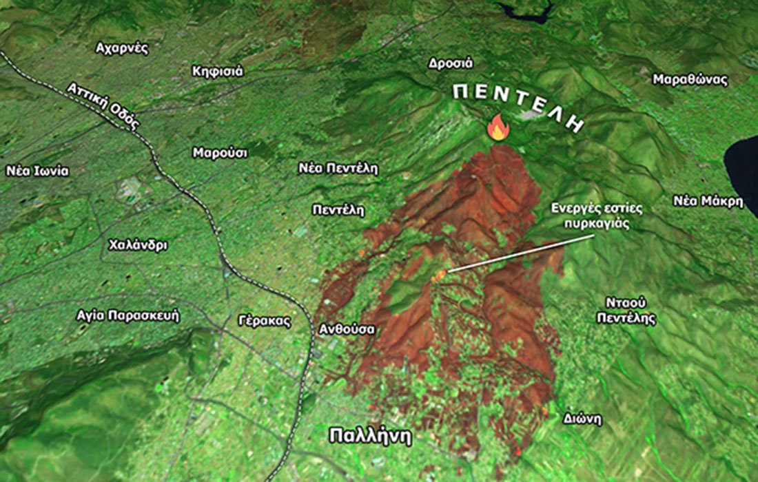 Τεράστια είναι η οικολογική καταστροφή στην Αττική από τη μεγάλη φωτιά στην Πεντέλη. Μία νέα δορυφορική εικόνα δείχνει την έκταση της πύρινης λαίλαπα, που έκαψε περισσότερα από 20.000 στρέμματα.