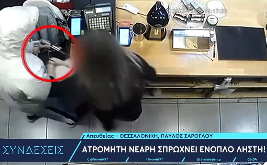 Στο βίντεο που δημοσίευσε η ΕΡT διακρίνεται ο ένας περνάει πίσω από τον πάγκο, και να προσπαθεί να αρπάξει το κινητό της υπαλλήλου. Η νεαρή αντιδρά και τον σπρώχνει ενώ βάζει τις φωνές αναγκάζοντας τους ληστές να φύγουν με άδεια χέρια.