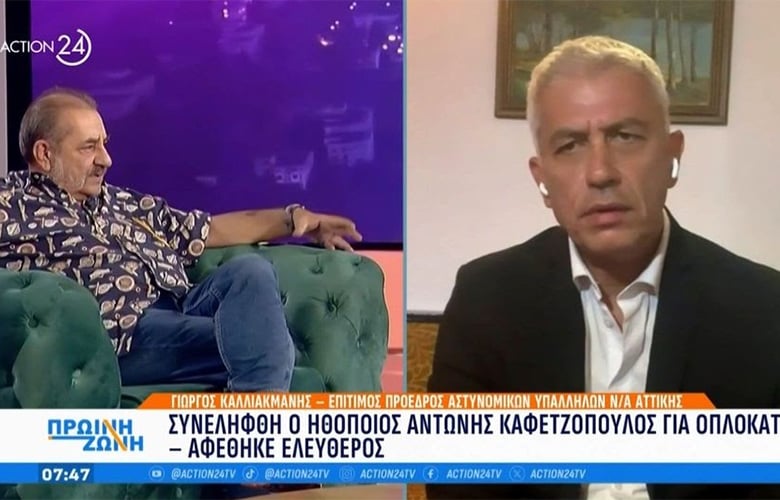 Διευκρινίσεις για τη σύλληψη του ηθοποιού Αντώνη Καφετζόπουλου έδωσε το πρωί της Πέμπτης 3/4 κατά τη διάρκεια τηλεοπτικής του συνέντευξης ο επίτιμος πρόεδρος Αστυνομικών υπαλλήλων Νοτιοανατολικής Αττικής, Γιώργος Καλλιακμάνης. «Ο νόμος περί όπλων λέει ότι και ρέπλικα να έχεις πας κατηγορούμενος» τόνισε χαρακτηριστικά.