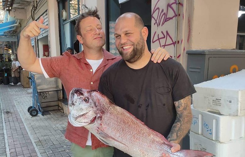 Ο Πέτρος Σέμκος δεν έχει δίπλα του κάποιον από τους συνεργάτες του, αλλά τον διεθνούς φήμης σεφ Τζέιμι Όλιβερ, ο οποίος πριν από λίγες μέρες πραγματοποίησε τηλεοπτικά γυρίσματα στη Θεσσαλονίκη και ανάμεσα στα καταστήματα που επισκέφτηκε για τις μαγειρικές λήψεις ήταν το ψαράδικο στο κέντρο της πόλης.