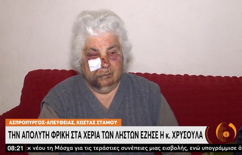 Θύμα άγριας επίθεσης από ληστές έπεσε μία ηλικιωμένη στον Ασπρόπυργο. Με εμφανή τα σημάδια από την κακοποίηση στο πρόσωπο η κ. Χρυσούλα μίλησε στην ΕΡΤ για την τρομακτική περιπέτεια και τις εφιαλτικές στιγμές που έζησε.