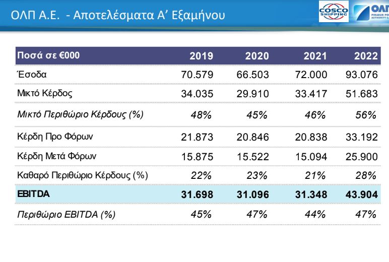 Όπως λοιπόν διαβάζουμε στις οικονομικές καταστάσεις του Α’ Εξαμήνου για το 2022 αύξηση κατά 29%, ήτοι 21,1 εκατ. ευρώ παρουσίασε ο κύκλος εργασιών της ΟΛΠ Α.Ε. κατά το Α’ εξάμηνο του 2022, με τον τελευταίο να ανέρχεται σε 93,1 εκατ. ευρώ έναντι 72,0 εκατ. ευρώ της αντίστοιχης περιόδου του προηγούμενου έτους.