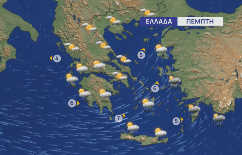 Την Πέμπτη κυρίως στα δυτικά, το ανατολικό Αιγαίο και τα Δωδεκάνησα και βαθμιαία στις Κυκλάδες και την Κρήτη προβλέπονται νεφώσεις παροδικά αυξημένες με τοπικές βροχές. Αργά το απόγευμα τα φαινόμενα θα περιοριστούν στην ανατολική νησιωτική χώρα θα ενταθούν θα εκδηλωθούν και καταιγίδες.