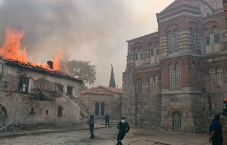 Οι φλόγες έχουν κυκλώσεις την ιστορική μονή του Οσίου Λουκά στη Βοιωτία. Η πυρκαγιά στο πέρασμά της έχει κάψει ολοσχερώς τον περίβολο του ιστορικού μοναστηριού.