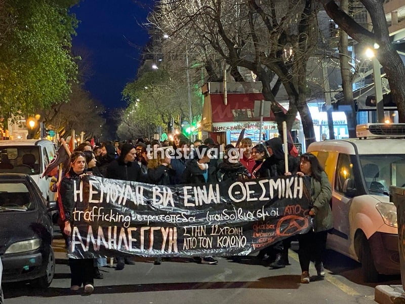 Πορεία διαμαρτυρίας πραγματοποιείται αυτή την ώρα στο κέντρο της Θεσσαλονίκης με αφορμή την εισαγγελική πρόταση στη δίκη για τον βιασμό και τη μαστροπεία της 12χρονης στον Κολωνό.