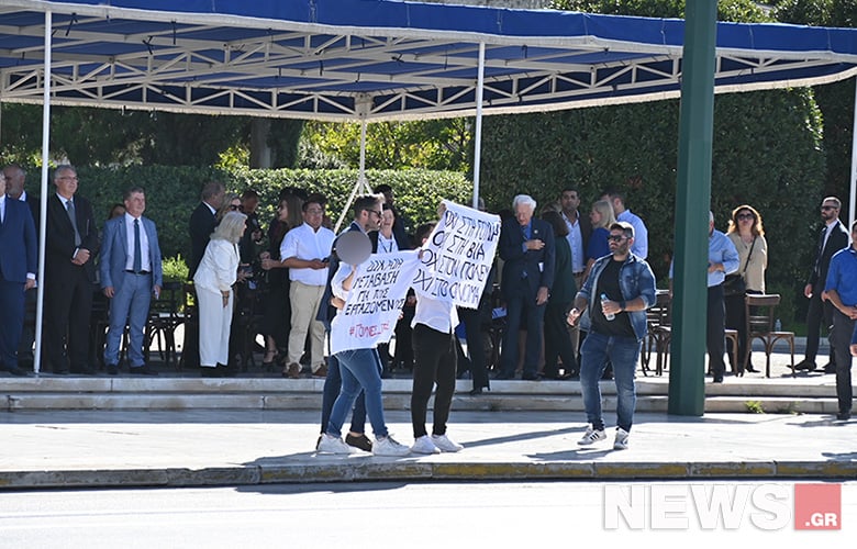 Μικρή αναστάτωση επικράτησε στη μαθητική παρέλαση στο κέντρο της Αθήνας, όταν δύο άτομα βρέθηκαν μπροστά από την εξέδρα των επισήμων και σήκωσαν δύο πλακάτ, ένα κατά του πολέμου κι ένα κατά του εμπορίου γούνας.