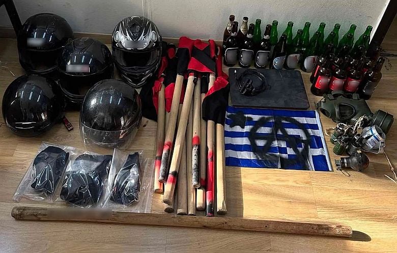 Ανάμεσα στα ευρήματα περιλαμβάνονται ρόπαλα, μια καμμένη ελληνική σημαία, δακρυγόνα και χειροβομβίδες κρότου λάμψης και άδεια μπουκάλια μπύρας που χρησιμοποιούνται σε βόμβες μολότοφ.