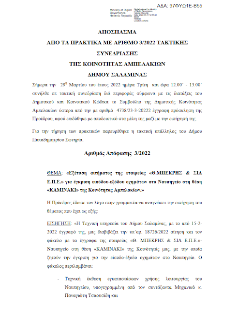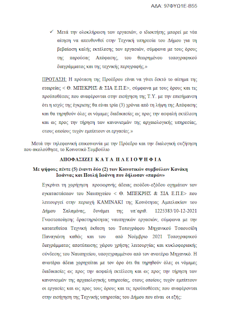 Την Δευτέρα 29 Μαρτίου 2022 το Κοινοτικό Συμβούλιο Αμπελακίων ενέκρινε έργο στις εγκαταστάσεις του Ναυπηγείου «Θ. ΜΠΕΚΡΗΣ & ΣΙΑ ΕΠΕ» κατά παράβαση της αρχαιολογικής νομοθεσίας και αντίθετα με την πάγια πρακτική των Δημοτικών και Κοινοτικών Συμβουλίων του Δήμου μας.